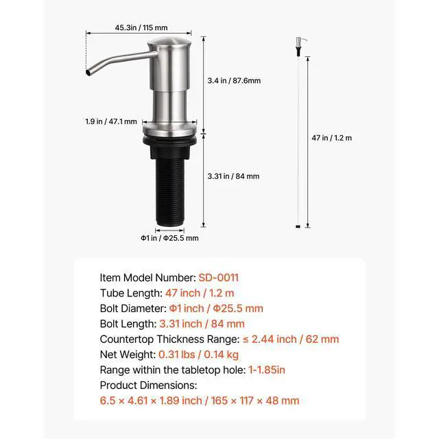 Countertop Thickness Range: 2.44 inch / 62 mm,Item Model Number: SD-0011,Bolt Diameter: 1 inch / 25.5 mm,Product Dimensions: 6.5 x 4.61 x 1.89 inch / 165 x 117 x 48 mm,Tube Length: 47 inch / 1.2 m,Net Weight: 0.31 lbs / 0.14 kg,Bolt Length: 3.31 inch / 84 mm