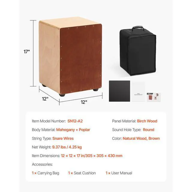 Body Material: Mahogany + Poplar,String Type: Snare Wires,Sound Hole Type: Round,Color: Natural Wood, Brown,Item Model Number: SN12-A2,Panel Material: Birch Wood,Product Dimensions: 12 x 12 x 17 in/305 x 305 x 430 mm,Net Weight: 9.37 lbs/4.25 kg