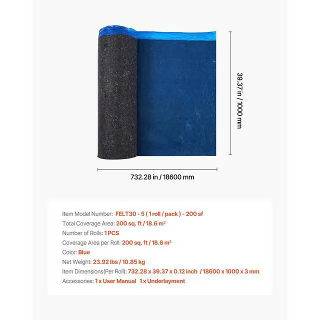 Coverage Area per Roll: 200 sq. ft / 18.6 m²,Item Dimensions (Per Roll): 665.35 x 39.37 x 0.12 inches / 16900 x 1000 x 3 mm,Number of Rolls: 1,Total Coverage Area: 200 sq. ft / 18.6 m²,Color: Blue,Item Model Number: FELT30-5(1roll/pack)-200sf,Net Weight: 23.92 lbs / 10.85 kg,Main Material: Recycled Fiber + PE Film