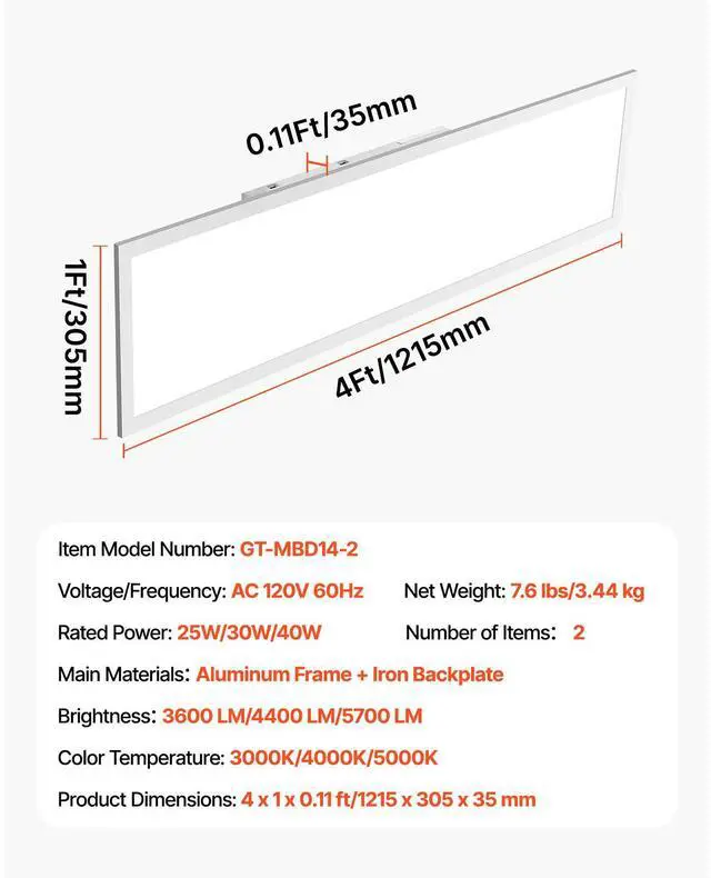 Voltage/Frequency: AC 120V, 60Hz,Color Temperature: 3000K/4000K/5000K,Brightness: 3600 LM/4400 LM/5700 LM,Item Model Number: GT-MBD14-2,Rated Power: 25W/30W/40W,Product Dimensions: 4 x 1 x 0.11 ft/1215 x 305 x 35 mm,Number of Items: 2,Net Weight: 7.6 lbs/3.44 kg,Main Material: Aluminum Frame + Iron Backplate