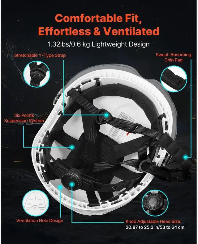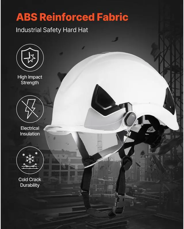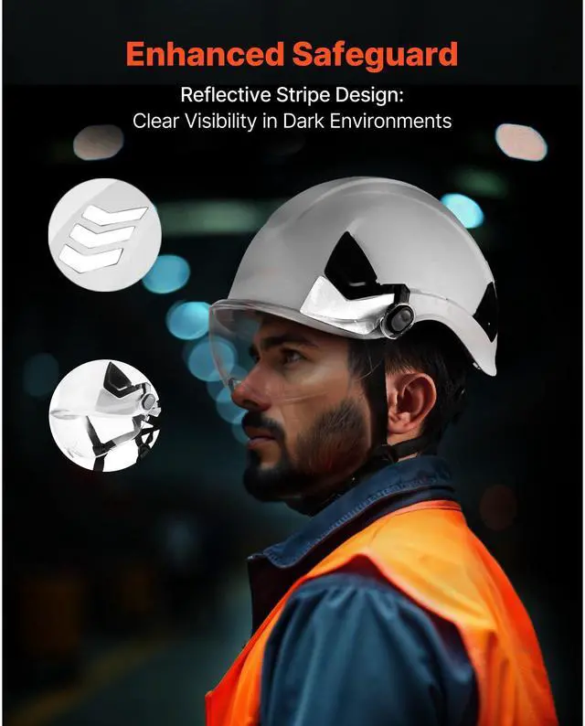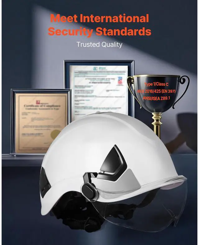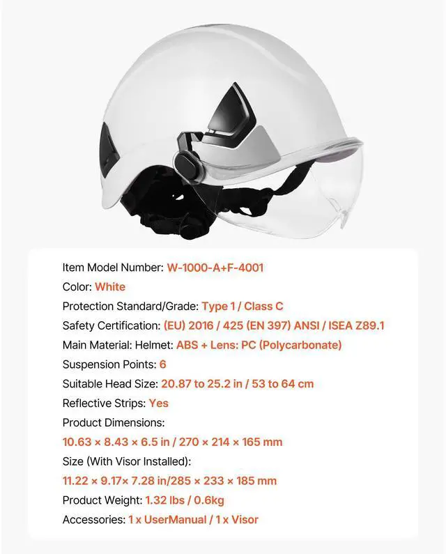Protection Standard/Grade: Type 1/Class C,Suitable Head Size: 20.87 to 25.2 in/53 to 64 cm,Color: White,Item Model Number: M-5015,Suspension Points: 6,Safety Certification: (EU) 2016/425 (EN 397) ANSI/ISEA Z89.1,Reflective Strips: Yes,Product Dimensions: 10.63 x 8.43 x 6.5 in/270 x 214 x 165 mm,Main Material: Helmet: ABS + Lens: PC (Polycarbonate),Item Weight: 1.32 lbs/0.6kg