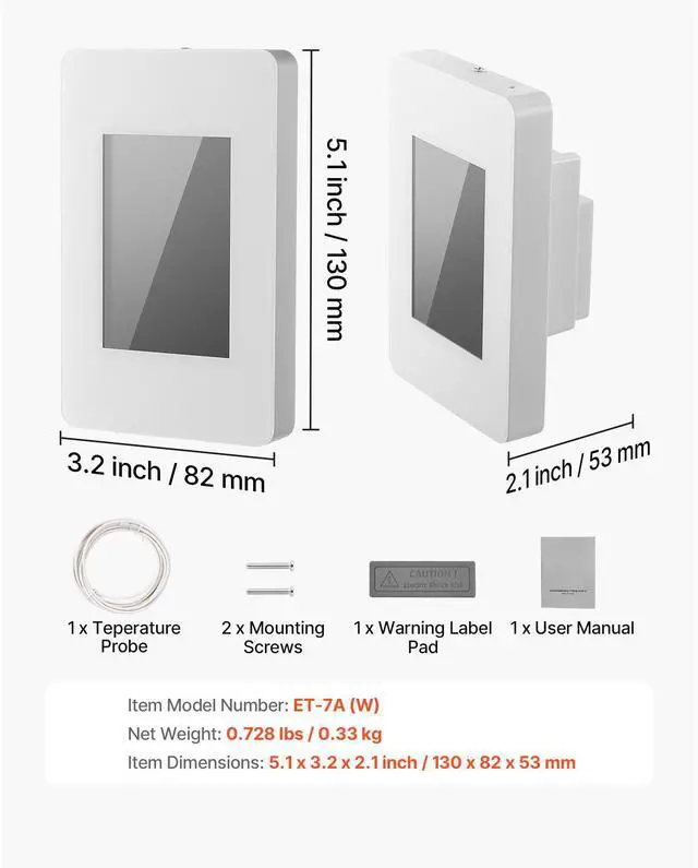 Protective Device: GFCI,Control Method: LCD Color Display + Touch Screen,Color: Gray-White,Item Model Number: ET-7A (W),Temperature Range: 41-104 / 5-40,Item Dimensions: 6.5 inch x 4.9 inch x 2.4 inch / 165 x 125 x 62 mm,Compatible with GFCI: Yes,Programming Function: Yes, 7-Day Time Range,Net Weight: 0.728 lbs / 0.33 kg,LCD Display Module: 3.5-inch TFT Color Display, 320 x 480 Resolution, Backlight,Main Material: ABS + PC,Power Supply: AC120/240V 60Hz 15A
