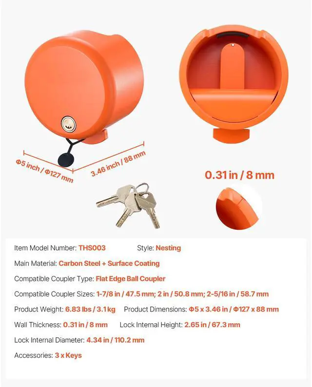 Compatible Coupler Type: Flat Edge Ball Coupler,Compatible Coupler Sizes: 1-7/8 in / 47.5 mm; 2 in / 50.6 mm; 2-5/16 in / 58.6 mm,Lock Internal Diameter: 4.34 in / 110.2 mm,Item Model Number: THS003,Product Weight: 6.83 lbs / 3.1 kg,Lock Internal Height: 2.65 in / 67.3 mm,Style: Nesting,Wall Thickness: 0.31 in / 8 mm,Product Dimensions: 5 x 3.46 in / 127 x 88 mm,Main Material: Carbon Steel + Surface Coating