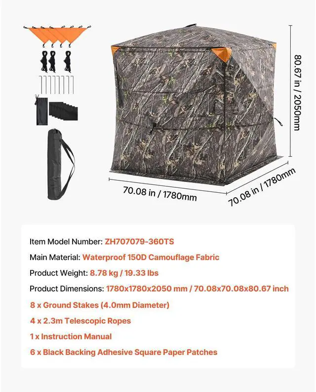 Item Model Number: ZH707079-360TS,Product Weight: 8.78 kg / 19.33 lbs,Product Dimensions: 1780x1780x2050 mm / 70.08x70.08x80.67 inch,Main Material: Waterproof 150D Camouflage Fabric
