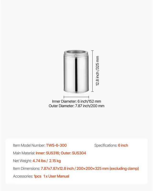 Specifications: 6 inch,Color: Silver,Item Model Number: TWS-6-300,Item Dimensions: 7.87 x 7.87 x 12.8 in / 200 x 200 x 325 mm (excluding clamp),Net Weight: 4.74 lbs / 2.15 kg,Main Material: Inner: SUS316; Outer: SUS304