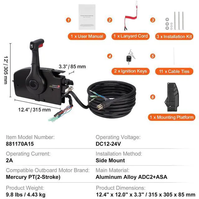 Installation Method: Side Mount,Compatible Outboard Motor Brand: Mercury PT(2-Stroke),Operating Voltage: DC12-24V,Item Model Number: 881170A15,Product Weight: 9.8 lbs / 4.43 kg,Product Dimensions: 12.4" x 12.0" x 3.3" / 315 x 305 x 85 mm,Operating Current: 2A,Main Material: Aluminum Alloy ADC2+ASA