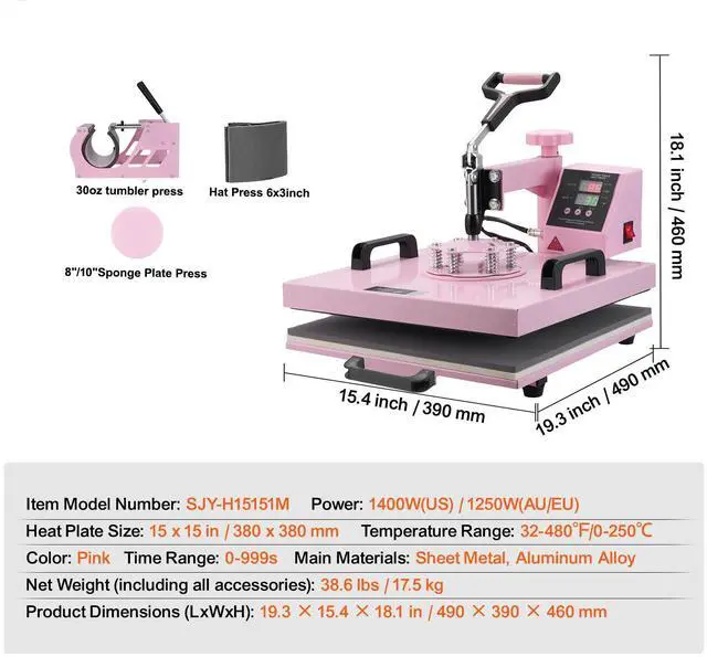 Heat Plate Size: 15 x 15 in / 380 x 380 mm,Main Materials: Sheet Metal, Aluminum Alloy,Net Weight (including all accessories): 38.6 lbs / 17.5 kg,Time Range: 0-999s,Color: Pink,Item Model Number: SJY-H15151M,Temperature Range: 32-480/0-250,Power: 1400W(US) / 1250W(AU/EU)