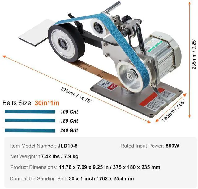 Rated Input Power: 550W,Compatible Sanding Belt: 30 x 1 inch / 762 x 25.4 mm,Item Model Number: JLD10-8,Product Dimensions: 14.76 x 7.09 x 9.25 in / 375 x 180 x 235 mm,Net Weight: 17.42 lbs / 7.9 kg