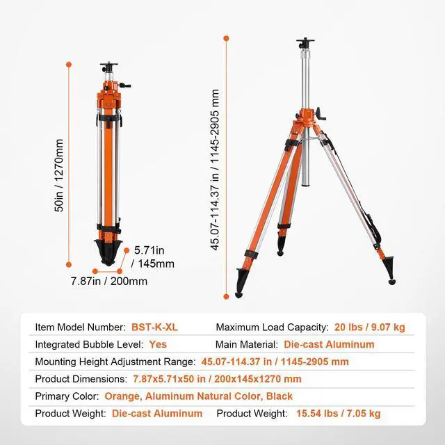 Primary Color: Orange, Aluminum Natural Color, Black,Item Model Number: BST-K-XL,Maximum Load Capacity: 20 lbs / 9.07 kg,Product Weight: 15.54 lbs / 7.05 kg,Product Dimensions: 7.87x5.71x50 in / 200x145x1270 mm,Mounting Height Adjustment Range: 45.07-114.37in/1145-2905mm,Main Material: Die-cast Aluminum,Integrated Bubble Level: Yes