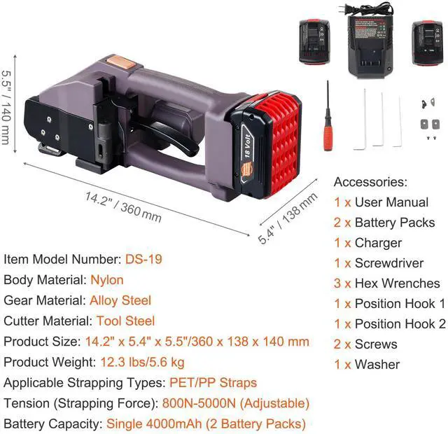 Body Material: Nylon,Battery Capacity: Single 4000mAh (2 Battery Packs),Tension (Strapping Force): 800N-5000N (Adjustable),Item Model Number: DS-19,Product Weight: 12.3 lbs/5.6 kg,Cutter Material: Tool Steel,Gear Material: Alloy Steel,Product Size: 14.2" x 5.4" x 5.5"/360 x 138 x 140 mm,Applicable Strapping Types: PET/PP Straps