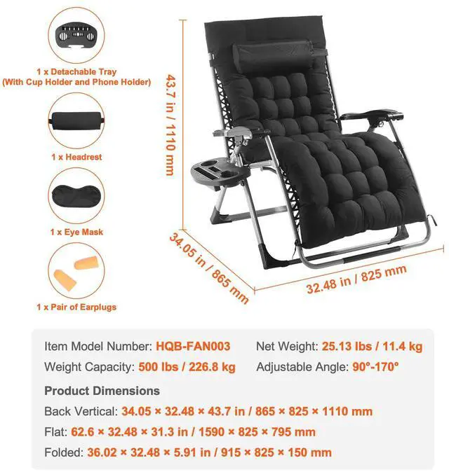 Back Vertical: 34.05 x 32.48 x 43.7 in/865 x 825 x 1110 mm,Folded: 36.02 x 32.48 x 5.91 in/915 x 825 x 150 mm,Weight Capacity: 500 lbs/226.8 kg,Color: Black,Item Model Number: HQB-FAN003,Flat: 62.6x32.48x31.3 in/1590 x 825 x 795 mm,Product Dimensions:,Net Weight: 25.13lbs/11.4kg,Adjustable Angle: 90°-170°