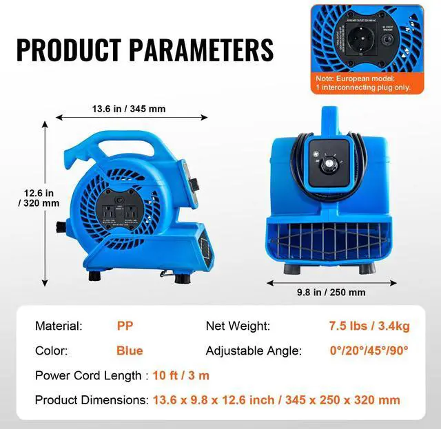Power Cord Length: 10 ft / 3 m,Current Limiting Protector Max Protection Current: 12A,Color: Blue,Item Model Number: DL-120-M1,Material: PP,Product Dimensions: 13.6 x 9.8 x 12.6 inch / 345 x 250 x 320 mm,Net Weight: 7.5 lbs / 3.4kg,Adjustable Angle: 0°/20°/45°/90°