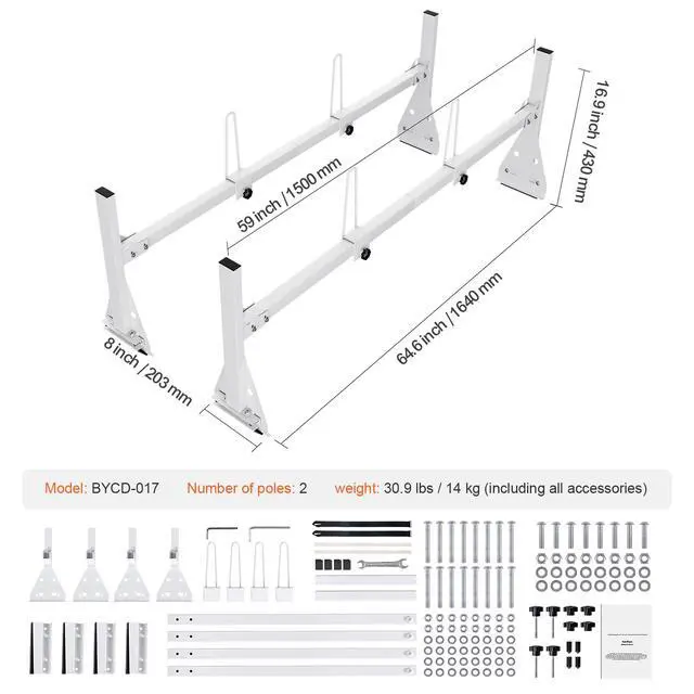 Item Size: 64.6×8.0×16.9 inch / 1640×203×430 mm,Number of Rods: 2,Item Model Number: BYCD-017,Maximum Load Capacity: 600 lbs,Item Length: 59 inch/1500 mm,Net Weight: 30.9 lbs / 14 kg (including all accessories),Main Material: Q235B