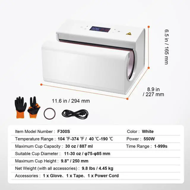 Suitable Cup Diameter: 2.95-3.35 in / 75-85 mm,Time Range: 1-999s,Maximum Cup Height: 9.8" / 250 mm,Color: White,Item Model Number: F300S,Temperature Range: 104 -374 / 40 -190 ,Maximum Cup Capacity: 30 oz / 887 ml,Net Weight (with all accessories): 9.8 lbs / 4.45 kg,Power: 550W