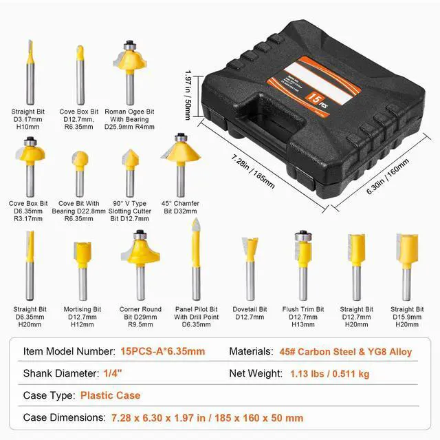 Case Type: Plastic Case,Materials: 45# Carbon Steel & YG8 Alloy,Item Model Number: 15PCS-A*6.35mm,Net Weight: 1.13 lbs / 0.511 kg,Shank Diameter: 1/4",Case Dimensions: 7.28 x 6.30 x 1.97 in / 185 x 160 x 50 mm