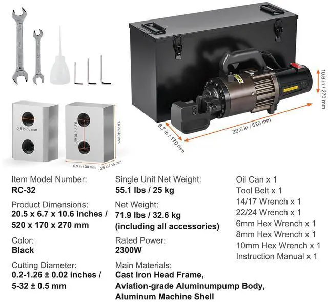 Main Materials: Cast Iron Head Frame, Aviation-grade Aluminumpump Body, Aluminum Machine Shell,Single Unit Net Weight: 55.1 lbs / 25 kg,Color: Black,Item Model Number: RC-32,Rated Power: 2300W,Product Dimensions: 20.5 x 6.7 x 10.6 inches / 520 x 170 x 270 mm,Net Weight: 71.9 lbs / 32.6 kg (including all accessories),Cutting Diameter: 0.2-1.26 ± 0.02 inches / 5-32 ± 0.5 mm