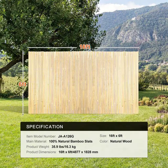Color: Natural Wood,Item Model Number: JA-A126G,Product Weight: 35.9 lbs/16.3 kg,Product Dimensions: 16ft x 6ft/4877 x 1828 mm,Main Material: 100% Natural Bamboo Slats