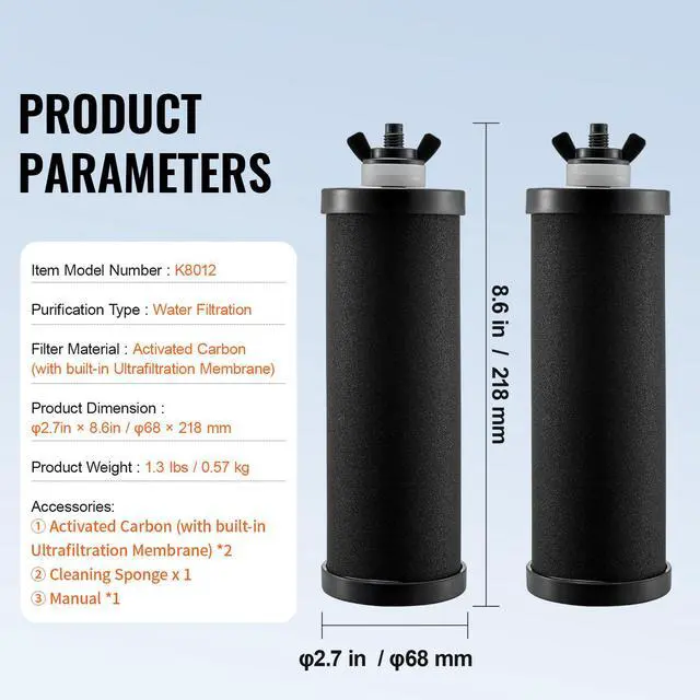 Item Model Number: K8012,Product Weight: 1.3 lbs / 0.57 kg,Filter Material: Activated Carbon (with built-in Ultrafiltration Membrane),Product Dimensions: 2.7"x8.6" / 68x218 mm,Purification Type: Water Filtration