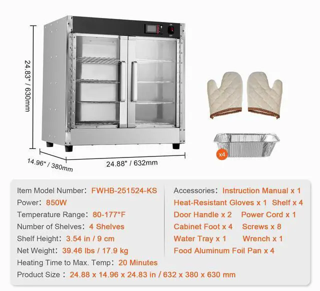 Number of Shelves: 4 Shelves,Heating Time to Maximum Temperature: 20 Minutes,Item Model Number: FWHB-251524-KS,Temperature Range: 80°F-177°F,Shelf Height: 3.54 inch / 9 cm,Net Weight: 39.46 lbs / 17.9 kg,Power: 850W