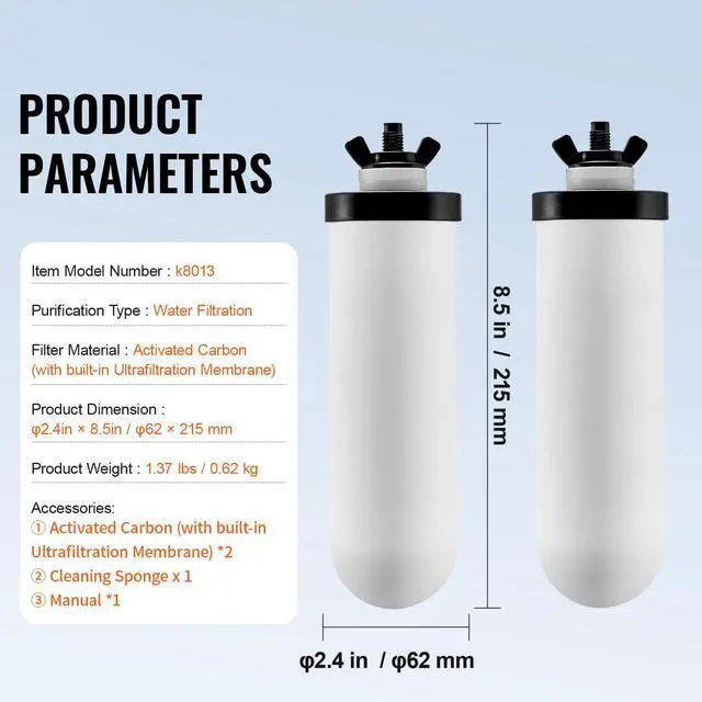 Item Model Number: K8013,Product Weight: 1.37 Ibs / 0.62 kg,Filter Material: Ceramic (with built-in Activated Carbon),Product Dimensions: 2.4"x8.5" / 62×215 mm,Purification Type: Water Filtration