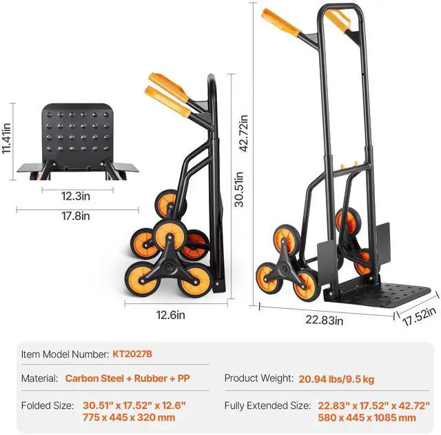 Load Capacity on Ground: 440 lbs/200 kg,Fully Extended Size: 22.83" x 17.52" x 42.72"/580 x 445 x 1085 mm,Item Model Number: KT2027B,Climbing Wheel Diameter: 4.92"/125 mm,Product Weight: 20.94 lbs/9.5 kg,Folded Size: 30.51" x 17.52" x 12.6"/775 x 445 x 320 mm,Material: Carbon Steel + Rubber + PP,Load Capacity When Climbing: 330 lbs/150 kg