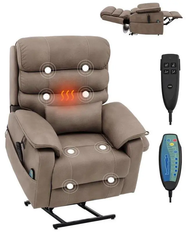Vevor Power Lift Recliner Chair, Medium-Wide Lay Flat Dual Motor Sofa with Massage and Heat for Elderly People, Cup Holders, Wireless Charging Pad, Light Brown