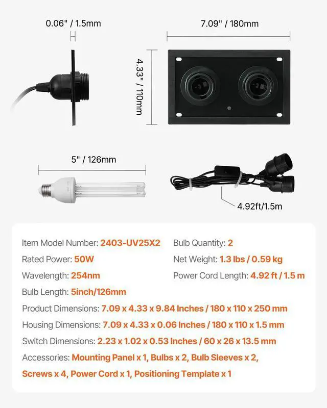 Power Cord Length: 4.92 ft / 1.5 m,Housing Dimensions: 7.09 x 4.33 x 0.06 Inches / 180 x 110 x 1.5 mm,Bulb Quantity: 2,Color: Black,Item Model Number: 2403-UV25X2,Switch Dimensions: 2.23 x 1.02 x 0.53 Inches / 60 x 26 x 13.5 mm,Rated Power: 50W (25W per bulb),Product Dimensions: 7.09 x 4.33 x 9.84 Inches / 180 x 110 x 250 mm,Net Weight: 1.3 lbs / 0.59 kg,Wavelength: 254nm,Bulb Length: 5 Inches / 126 mm,Main Material: Steel