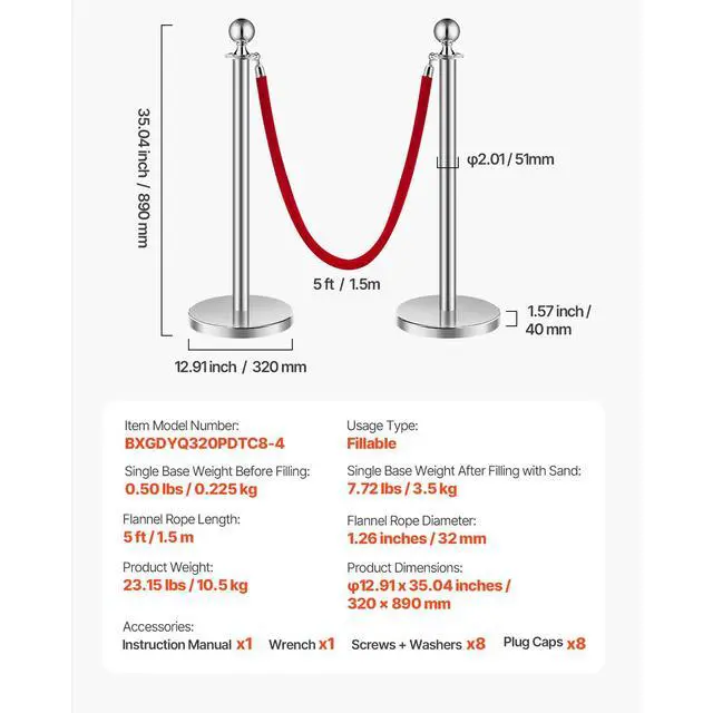 Usage Type: Fillable,Single Base Weight Before Filling: 0.50 lbs / 0.225 kg,Single Base Weight After Filling with Sand: 7.72 lbs / 3.5 kg,Item Model Number: BXGDYQ320PDTC8-4,Product Weight: 23.15 lbs / 10.5 kg,Flannel Rope Diameter: 1.26 inches / 32 mm,Product Dimensions: 12.91 x 35.04 inches / 320 x 890 mm,Flannel Rope Length: 4.92 ft / 1.5 m