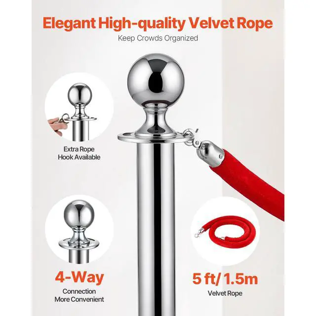 VEVOR Stanchions and Velvet Ropes 8Pcs, Hollow Base with Stainless Steel Post, 4 Red Velvet Ropes and Posts, Crowd Control Barriers Silver Stanchions, Red Carpet Runner Poles for Party Supplies