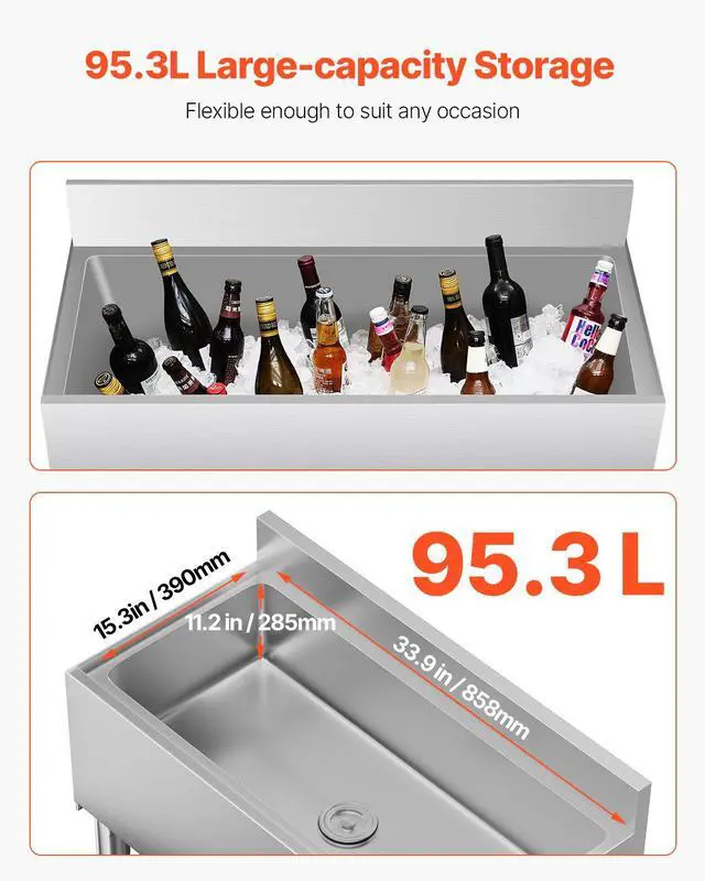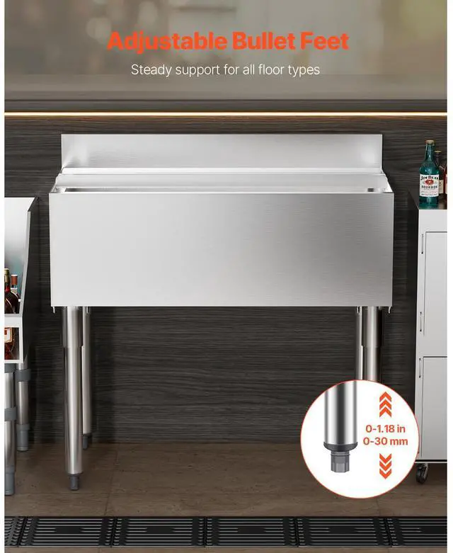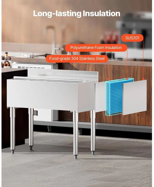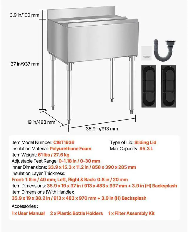 Insulation Material: Polyurethane Foam,Insulation Layer Thickness: Front: 1.6 in / 40 mm; Left, Right & Back: 0.8 in / 20 mm,Type of Lid: Sliding Lid,Inner Dimensions: 33.9 x 15.3 x 11.2 in / 858 x 390 x 285 mm,Adjustable Feet Range: 0-1.18 in / 0-30 mm,Max Capacity: 95.3 L,Item Model Number: CIBT1936,Item Dimensions: 35.9 x 19 x 37 in / 913 x 483 x 937 mm + 3.9 in (H) Backsplash,Item Dimensions (With Handle): 35.9 x 19 x 38.2 in / 913 x 483 x 970 mm + 3.9 in (H) Backsplash,Insulation Duration: 24 Hours,Item Weight: 61 lbs / 27.6 kg