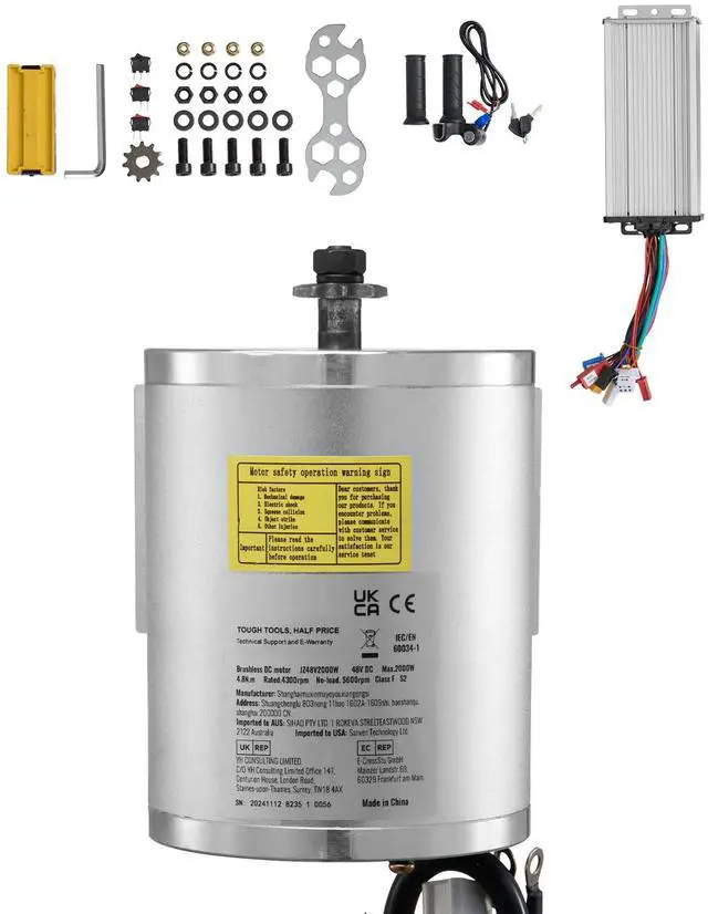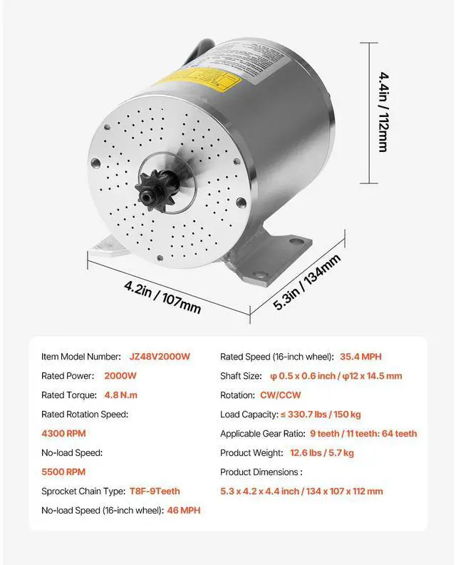 Applicable Gear Ratio: 9 teeth / 11 teeth: 64 teeth,No-load Rotation Speed: 5600 RPM,Load Capacity: 330.7 lbs / 150 kg,Rated Rotation Speed: 4300 RPM,Item Model Number: JZ48V2000W,Product Weight: 12.6 lbs / 5.7 kg,Rated Power: 2000W,Product Dimensions: 5.3 x 4.2 x 4.4 inch / 134 x 107 x 112 mm,Rated Torque: 4.8N·m,Rotation: CW/CCW