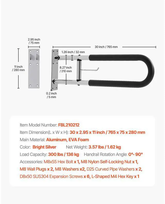 Load Capacity: 300 lbs / 136 kg,Handrail Rotation Angle: 0°- 90°,Color: Bright Silver,Item Model Number: FBL210212,Net Weight: 3.57 lbs / 1.62 kg,Main Material: Aluminum, EVA Foam,Item Dimension(L x W x H): 11 x 2.95 x 30 inch / 280 x 75 x 765 mm
