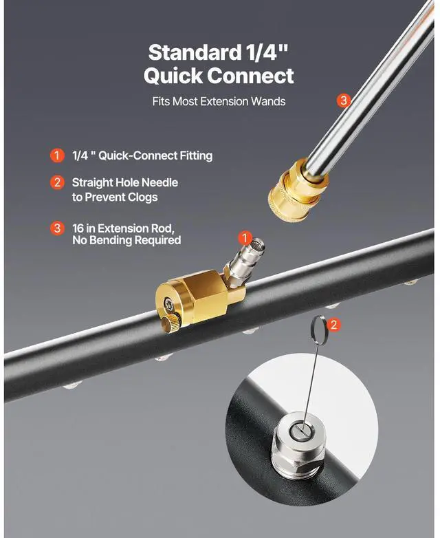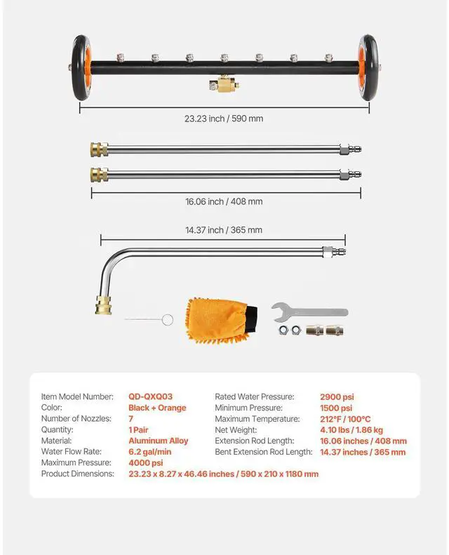 Number of Nozzles: 7,Color: Black + Orange,Material: Aluminum Alloy,Product Dimensions: 23.23 x 8.27 x 46.46 inches / 590 x 210 x 1180 mm,Maximum Temperature: 212 / 100,Extension Rod Length: 16.06 inches / 408 mm,Bent Extension Rod Length: 14.37 inches / 365 mm,Water Flow Rate: 6.2 gal/min,Item Model Number: QD-QXQ03,Minimum Pressure: 1500 psi,Net Weight: 4.10 lbs / 1.86 kg,Maximum Pressure: 4000 psi,Rated Water Pressure: 2900 psi