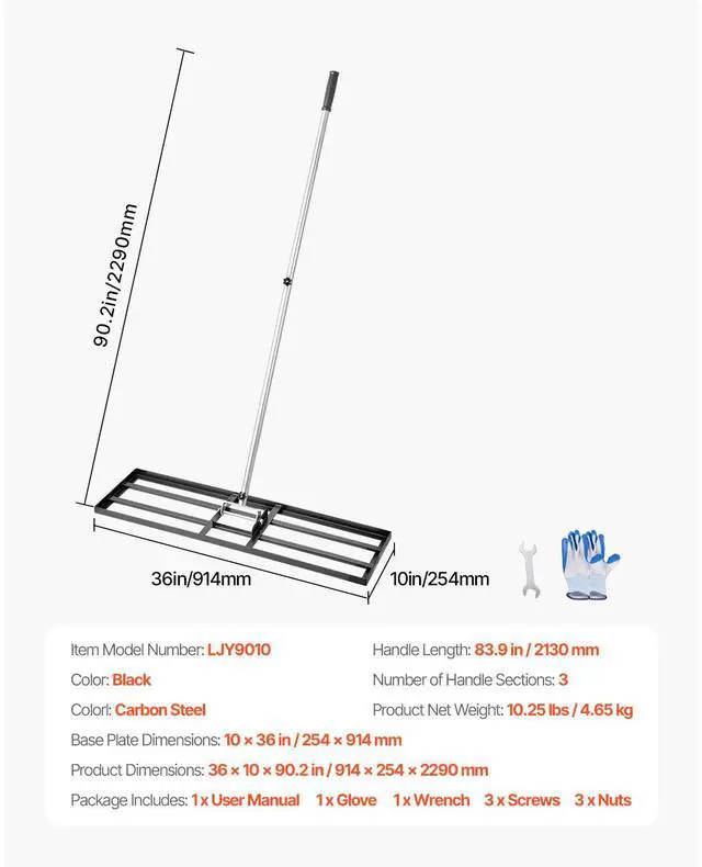 Handle Length: 83.9 in / 2130 mm,Base Plate Dimensions: 10 x 36 in / 254 x 914 mm,Color: Black,Item Model Number: LJY9010,Product Net Weight: 10.25 lbs / 4.65 kg,Number of Handle Sections: 3,Product Dimensions: 36 x 10 x 90.2 in / 914 x 254 x 2290 mm,Main Material: Carbon Steel