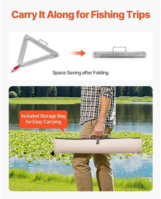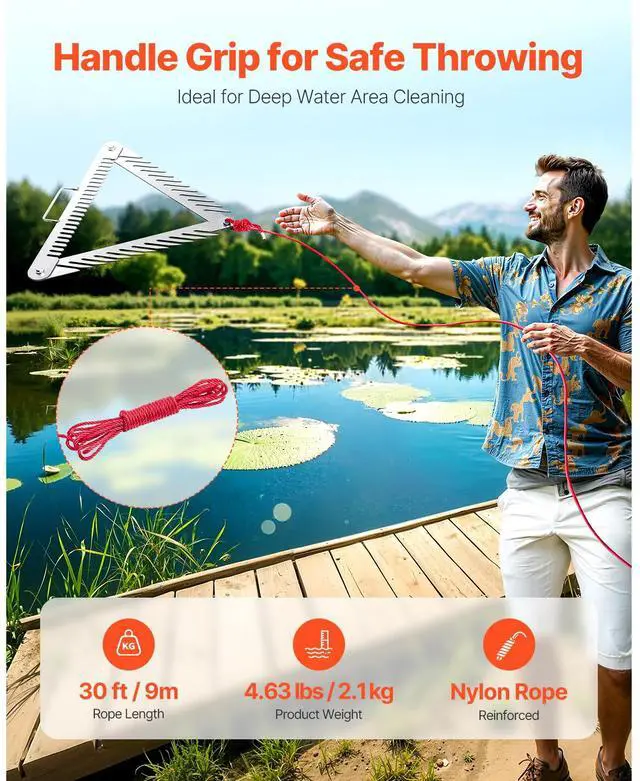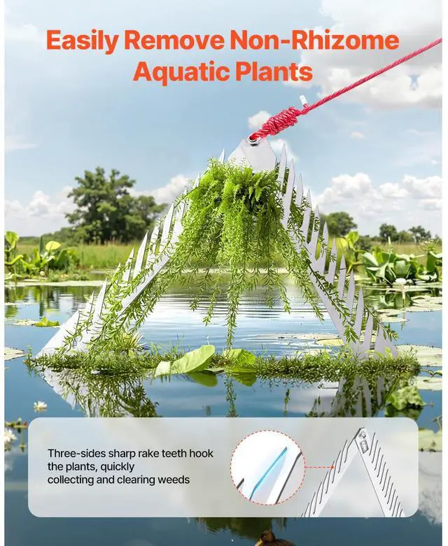 24" Pond Aquatic Weed Rake with Handle 3-Sided Foldable Lake Weed Rake 30ft Rope