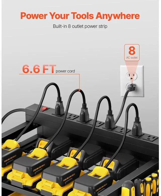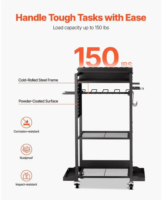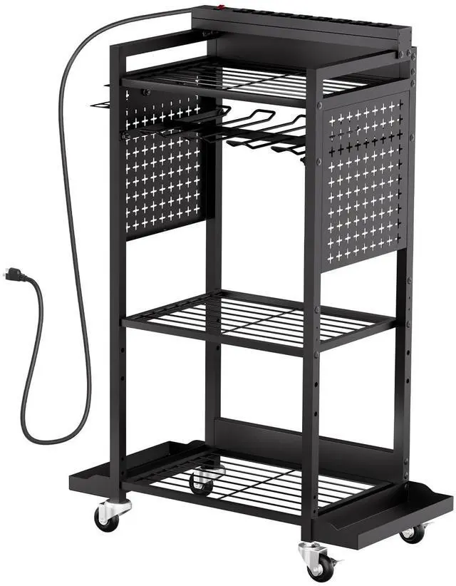 Power Tool Rack Capacity: 30 lbs / 13.6 kg,Number of Tiers: 4,Power Strip Rating: 15A 125V 60Hz, Max. 1875W,Color: Black,Overall Product Size: 16.5 x 11.8 x 34.1 in / 420 x 300 x 865 mm (Height includes casters; width excludes accessories),Item Model Number: ETT01,Product Weight: 17.3 lbs / 7.85 kg,Power Strip Rating Cord Length: 6.6 ft / 2 m,Total Load Capacity: 150 lbs / 68 kg,Per Shelf Load Capacity: 40 lbs / 18.1 kg,Wheels Quantity: 4 swivel casters (2 with brakes),Pegboard Panel Dimensions: 10.6 x 10.2 in / 270 x 260 mm