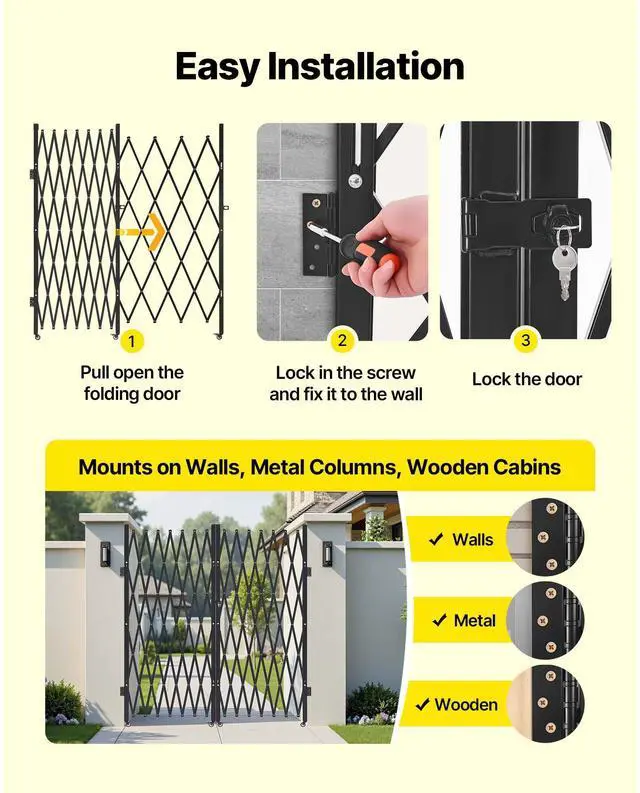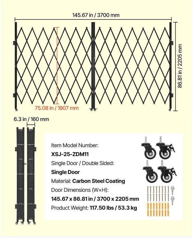 VEVOR Double Folding Security Gate, Lockable Scissor Gate with 360° Swivel Casters, Outdoor Barricade Steel Retractable Gates, for Entry Security, Garage, Warehouse & Pool, 145.67 x 86.81 in (W x H)