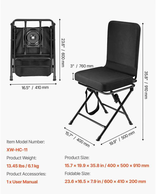 Seat Size: 15.8 x 13.0 in/400 x 330 mm,Load Capacity: 300 lbs/136 kg,Item Model Number: XW-HC-11,Seat Height: 19.3 in/490 mm,Foldable Size: 23.6 x16.5 x 7.9 in/600 x 410 x 200 mm,Net Weight: 13.45 lbs/6.1 kg,Product Size: 15.7 x 19.9 x 35.8 in/400 x 500 x 910 mm