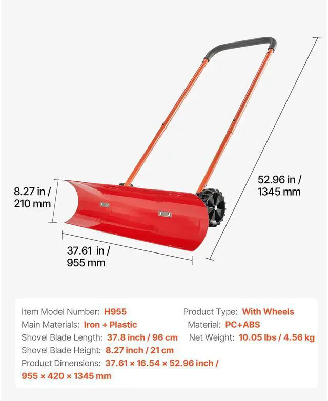 Main Materials: Iron + Plastic,Product Type: With Wheels,Shovel Blade Height: 8.27 inch / 21 cm,Item Model Number: H955,Material: PC+ABS,Shovel Blade Length: 37.8 inch / 96 cm,Product Dimensions: 37.61 x 16.54 x 52.96 inch / 955 x 420 x 1345 mm,Net Weight: 10.05 lbs / 4.56 kg