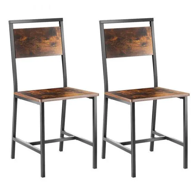 Set of 2 Wooden Dining Chairs Farmhouse Kitchen Chair Metal Frame Backrest Brown
