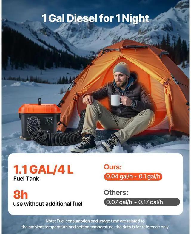 Fuel Consumption: 0.04 - 0.1 gal/h (0.160.4 L/h),Operating Noise: 75 dB,Temperature Adjustment Range: 46.496.8 / 836 (10-level adjustable),Item Model Number: XMZ-TB30,Air-Fuel Ratio: 24004400 rpm, 2.06.1 Hz,Operating Altitude: Below 9842 ft / 3000 m,Fuel Tank Capacity: 1.1 GAL / 4 L,Overheat Protection: 536 / 280,Air Outlet Diameter: 2.9 inch / 75 mm,Combustion Efficiency: 90%,Product Dimensions: 16.9 x 11.8 x 10.0 inch / 430 x 300 x 255 mm,Net Weight: 17.2 lbs / 7.8 kg (including all accessories)
