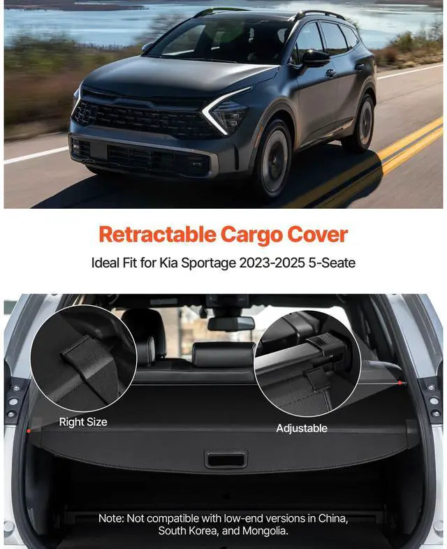 Max Extended Length of Retractable Cover: 34.1 in / 865 mm,Surface Texture: Leather Texture,Main Materials: Nylon + PVC + Aluminum Profile,End Cap Cross-Section Dimensions (W x H): 1.8 x 1.8 in / 45 x 47 mm,Color: Black,Item Model Number: 23-25 Kia Sportage-P,Compatible Brand & Model: Original Kia Sportage 2023-2025 5-Seater (Not compatible with low-end versions in China, South Korea, and Mongolia; no installation position),Product Dimensions: 52.4 x 7.9 x 2.2 in / 1330 x 200 x 56 mm,Net Weight: 4.2 lbs / 1.9 kg