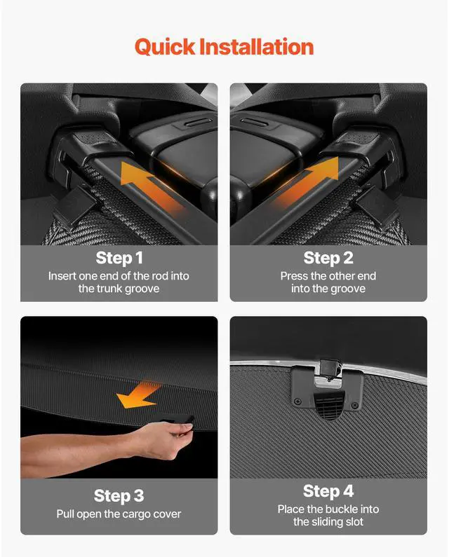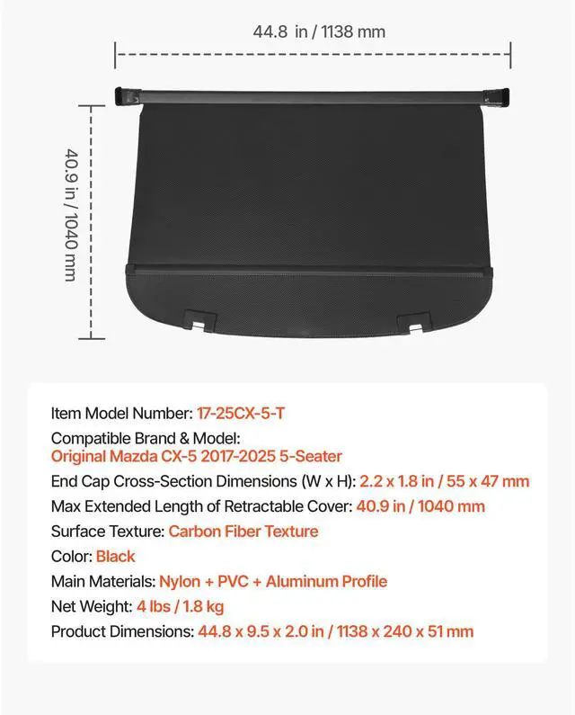Max Extended Length of Retractable Cover: 40.9 in / 1040 mm,Surface Texture: Carbon Fiber Texture,Main Materials: Nylon + PVC + Aluminum Profile,End Cap Cross-Section Dimensions (W x H): 2.2 x 1.8 in / 55 x 47 mm,Color: Black,Item Model Number: 17-25CX-5-T,Compatible Brand & Model: Original Mazda CX-5 2017-2025 5-Seater,Product Dimensions: 44.8 x 9.5 x 2.0 in / 1138 x 240 x 51 mm,Net Weight: 4 lbs / 1.8 kg