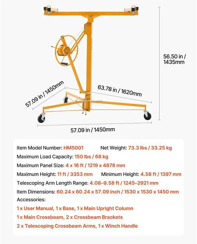Telescoping Arm Length Range: 4.099.58 ft / 12452921 mm,Color: Yellow,Item Model Number: HM5001,Maximum Load Capacity: 150 lbs / 68 kg,Maximum Panel Size: 4 x 16 ft / 1219 x 4878 mm,Maximum Height: 11 ft / 3353 mm,Item Dimensions: 60.24 x 60.24 x 57.09 inch / 1530 x 1530 x 1450 mm,Net Weight: 73.3 lbs / 33.25 kg,Main Material: Q235B Steel,Minimum Height: 4.58 ft / 1397 mm