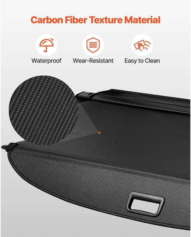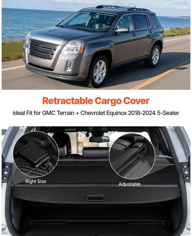 Max Extended Length of Retractable Cover:,29 in / 737 mm (excluding rear cover):,Surface Texture: Carbon Fiber Texture,Main Materials: Nylon + PVC + Aluminum Profile,End Cap Cross-Section Dimensions (W x H): 2.1 x 1.9 in / 52 x 48 mm,Color: Black,Item Model Number: 18-24 Equinox-T,Compatible Brand & Model: Extended Version for GMC Terrain + Chevrolet Equinox 2018-2024 5-Seater,34.8 in / 885 mm (including rear cover):,Product Dimensions: 52.4 x 13.0 x 2.0 in / 1330 x 330 x 50 mm,Net Weight: 4.1 lbs / 1.85 kg