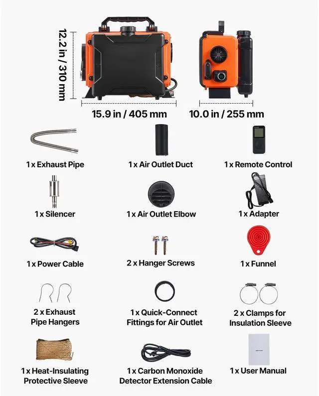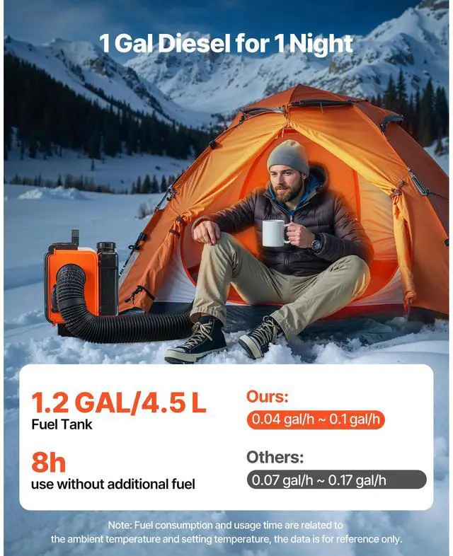 Fuel Consumption: 0.04 - 0.1 gal/h (0.160.4 L/h),Operating Noise: 75 dB,Temperature Adjustment Range: 46.496.8 / 836 (10-level adjustable),Item Model Number: XMZ-HTB1,Air-Fuel Ratio: 24004400 rpm, 2.06.1 Hz,Operating Altitude: Below 9842 ft / 3000 m,Fuel Tank Capacity: 1.2 GAL / 4.5 L,Overheat Protection: 536 / 280,Air Outlet Diameter: 2.9 inch / 75 mm,Combustion Efficiency: 90%,Product Dimensions: 15.9 x 10.0 x 12.2 inch / 405 x 255 x 310 mm,Net Weight: 19.1 lbs / 8.65 kg (including all accessories)