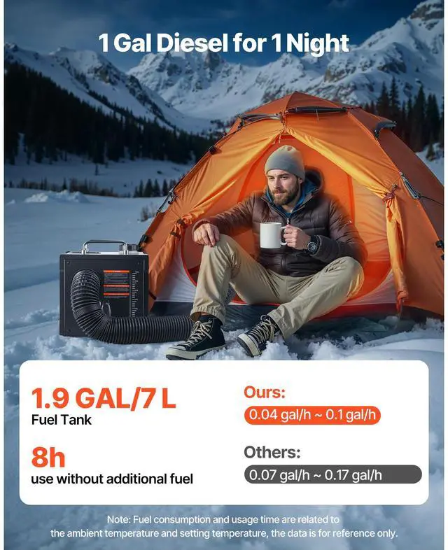 Fuel Consumption: 0.04 - 0.1 gal/h (0.160.4 L/h),Operating Noise: 75 dB,Temperature Adjustment Range: 46.496.8 / 836 (10-level adjustable),Item Model Number: XMZ-TB40,Air-Fuel Ratio: 24004400 rpm, 2.06.1 Hz,Operating Altitude: Below 9842 ft / 3000 m,Fuel Tank Capacity: 1.9 GAL / 7 L,Overheat Protection: 536 / 280,Air Outlet Diameter: 2.9 inch / 75 mm,Combustion Efficiency: 90%,Product Dimensions: 15.1 x 11.8 x 11.8 inch / 385 x 300 x 300 mm,Net Weight: 20.6 lbs / 9.35 kg (including all accessories)