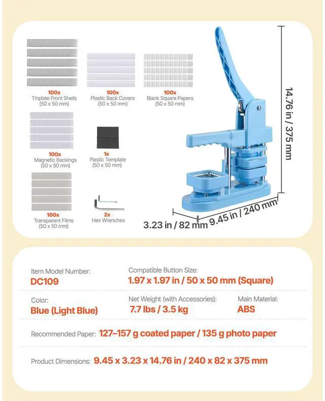 Compatible Button Size: 1.97 x 1.97 in / 50 x 50 mm (Square),Recommended Paper: 127157 g coated paper / 135 g photo paper,Color: Blue (Light Blue),Item Model Number: DC109,Net Weight (with Accessories): 7.7 lbs / 3.5 kg,Product Dimensions: 9.45 x 3.23 x 14.76 in / 240 x 82 x 375 mm,Main Material: ABS
