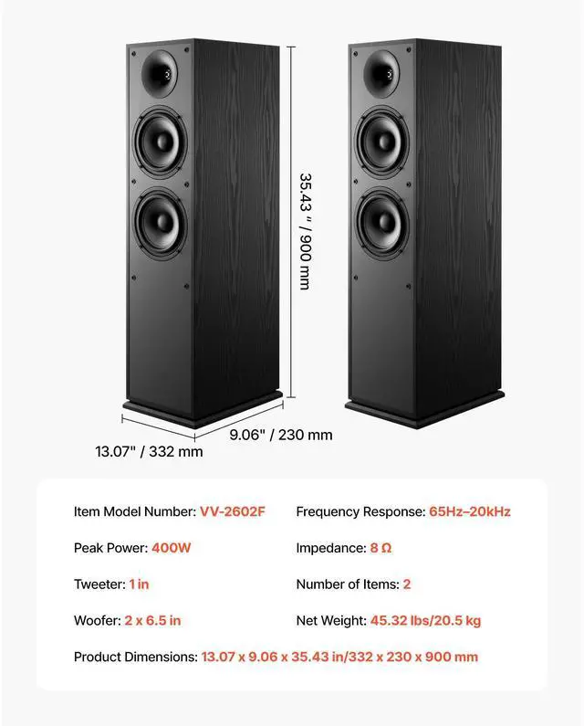 Peak Power: 400W,Tweeter: 1 in,Item Model Number: VV-2602F,Woofer: 2 x 6.5 in,Frequency Response: 65Hz20kHz,Impedance: 8 ,Number of Items: 2
