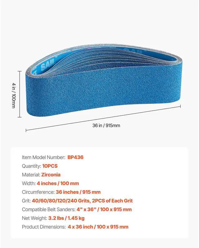 Grit: 40/60/80/120/240 Grits, 2PCS of Each Grit,Item Model Number: BP436,Circumference: 36 inches / 915 mm,Quantity: 10PCS,Material: Zirconia,Product Dimensions: 4 x 36 inch / 100 x 915 mm,Width: 4 inches / 100 mm,Net Weight: 3.2 lbs / 1.45 kg,Compatible Belt Sanders: 4 x 36 / 100 x 915 mm